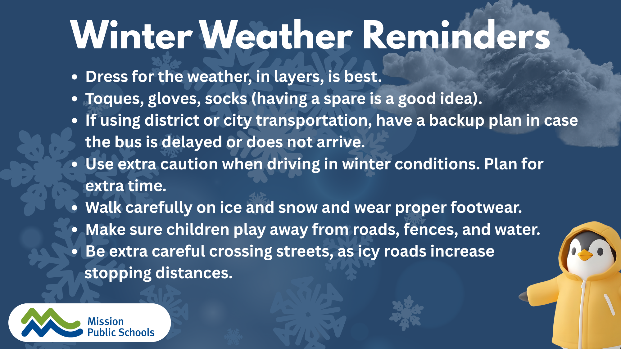 Beginning at approximately 3:00 AM, our Facilities Department begins investigating road and site conditions at all schools. Unpredictable conditions can be a result of the varying terrain and elevations within Mission. For this reason, road assessments take place across the city. District crews analyze the estimated time it will take for snow and ice to be cleared from parking lots, sidewalks and buses. Other concerns include fallen or low-lying trees, power outages, accidents, traffic flow, and other unfolding events. Sidewalks with excessive snow due to street snow removal are also a safety concern, especially along corridors where students normally walk to school.
